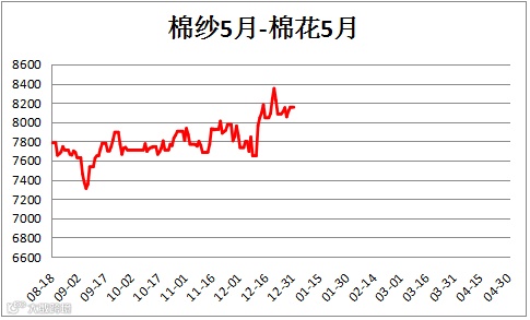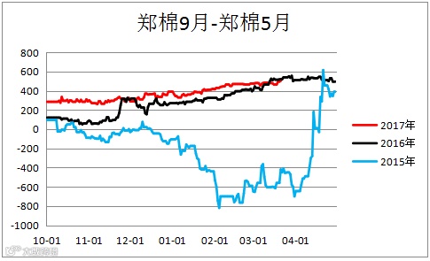 棉花跨期价差(CF1809– CF1805)震荡上行,未来行情有待观望。