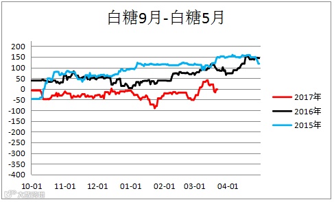 白糖跨期价差(SR1809– SR1805)震荡下行,建议观望。