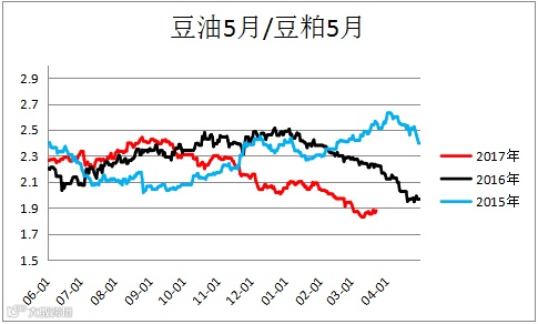 油粕比(Y1805/ M1805, OI1805 / RM1805)震荡,市场整体上呈现外强内弱,粕强油弱的格局,油脂基本面压力始终没有得到有效缓解,建议进行买粕抛油的套利操作。