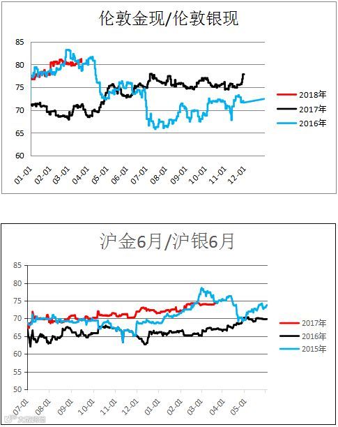 伦敦金银价比,沪金沪银价比(AU1806 / AG1806)区间震荡,未来行情有待观望。