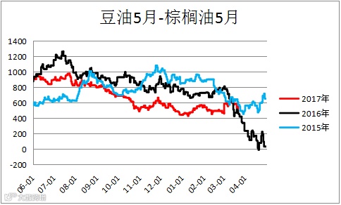 豆棕价差(Y1805– P1805)震荡,建议观望。