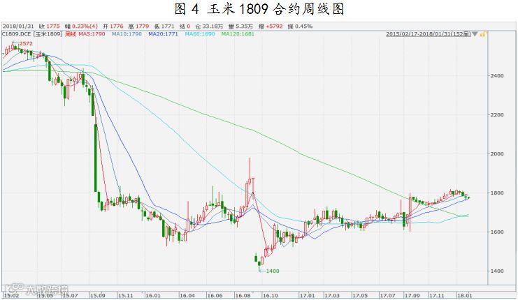 2015年,我国首次下调玉米收购价,内蒙古、辽宁、吉林、黑龙江玉米收购价统一为2000元/吨,下调幅度在220-260元/吨;2016年初,东北三省和内蒙古自治区取消玉米临时收储政策调整为“市场化收购”加“补贴”的新机制,标志着玉米临储政策退出历史舞台。收储政策调整的核心是调整玉米价格,使之回到合理的水平范围之内,达到“市场定价、价补分离”的目标。2017年,随着玉米供给侧改革各项政策的推进,玉米期货指数始终维持在1500元以上区间运行。随着玉米库存压力的不断释放,玉米供应压力逐步减轻,最艰难的时刻已然过去,1400-1500元或将成为历史性底部,并且会随着库存压力的减轻,价格重心将呈现逐步上移的态势。不过,庞大库存的消耗仍然需要时间,因此,一定程度上也限制了2018年的上行空间。