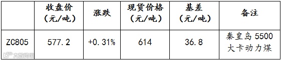 昨日动力煤主力合约ZC805开盘于574.6元/吨,最高577.8元/吨,最低570.2元/吨,报收于577.2元/吨。较前一交易日上涨1.8元/吨,涨幅为0.31%。