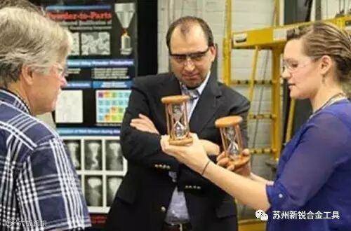 一个简单的沙漏测试揭示了该材料的好处。Ames Lab的冶金学家Iver Anderson和Emma White喜欢向访客展示定制沙漏中的金属粉末样品。当沙漏翻转时,客人可以看到Ames的金属粉末和传统制造的金属粉末之间的区别。传统制造的粉末不是很流畅地通过沙漏的颈部,而且当停止和启动,需要被摇晃一下。另一方面,气体雾化的Ames粉末顺利且快速地通过沙漏。