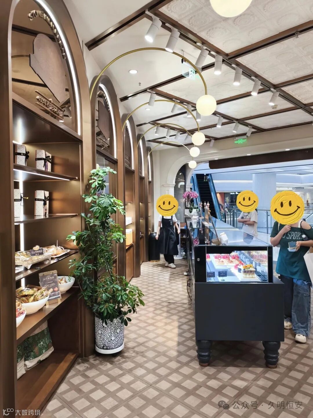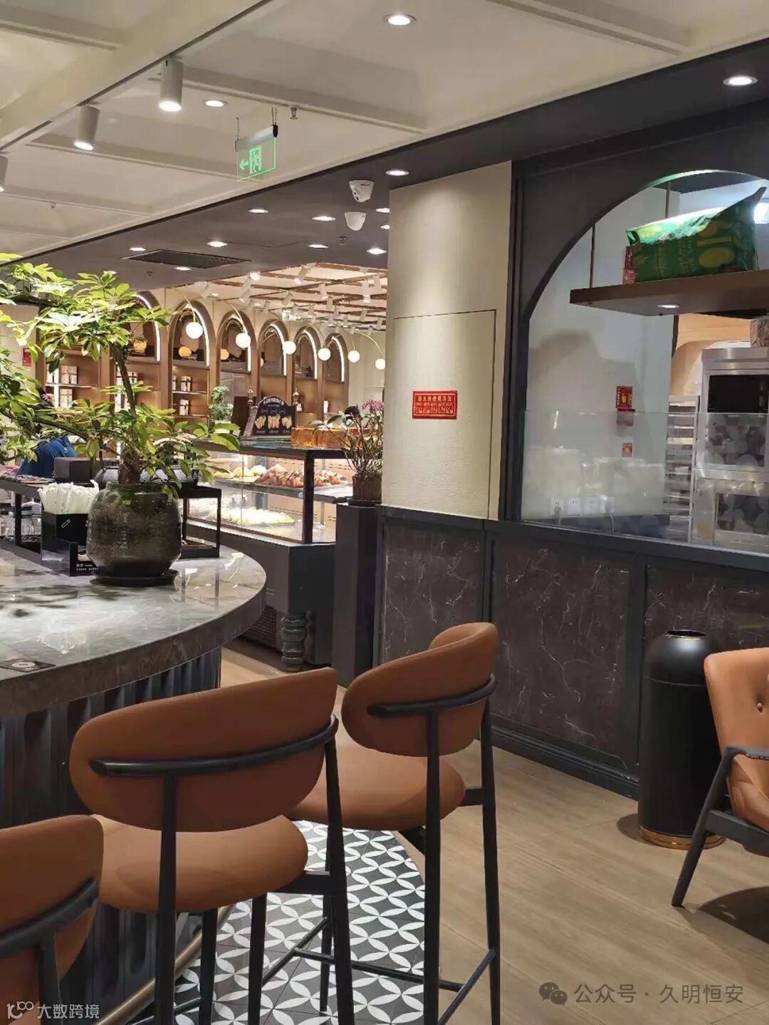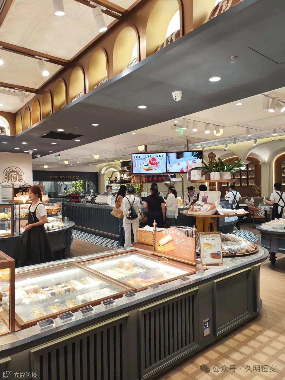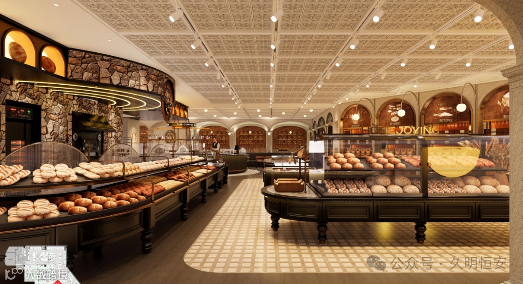 空间开阔而通透,布局讲究对称与平衡。展示柜和操作区域分布合理,既方便顾客挑选商品,又能让烘焙师高效地工作。