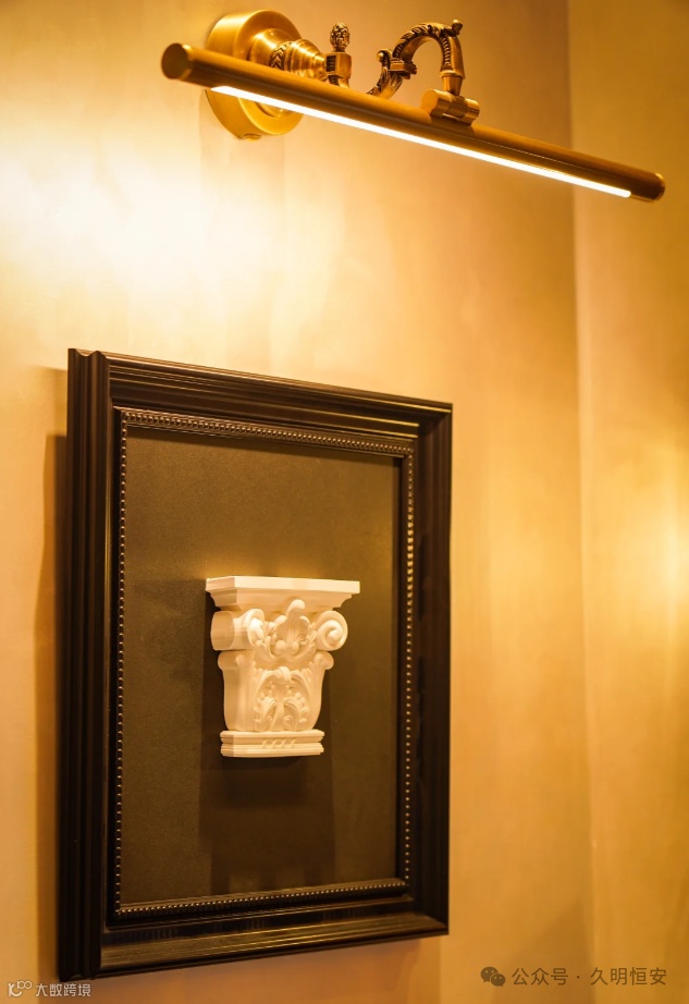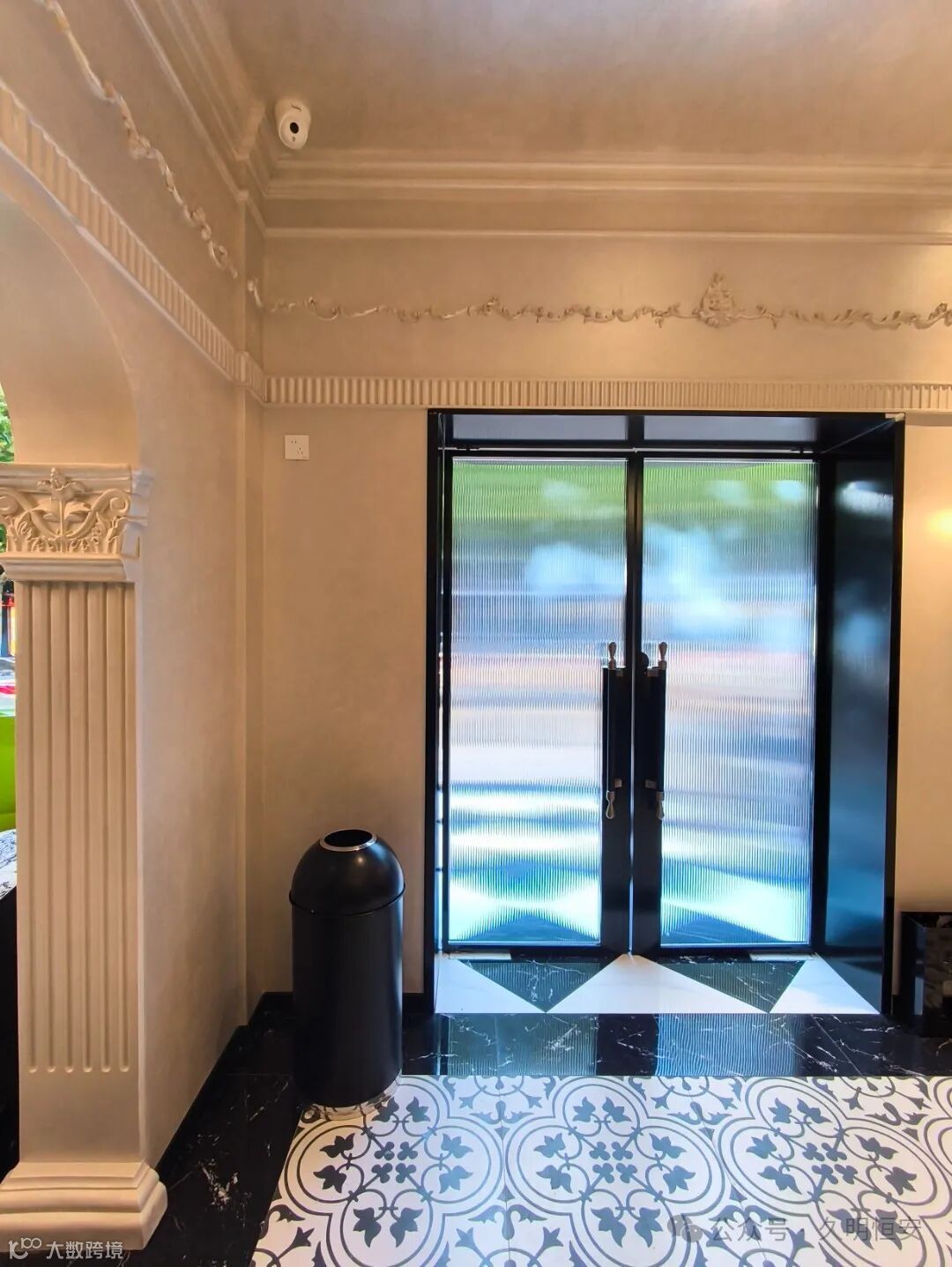 房间内的壁灯和中央的大型吊灯,为空间增添了奢华感。墙面装饰性的白色线条和拱形门框,增加了空间的装饰性和深度。