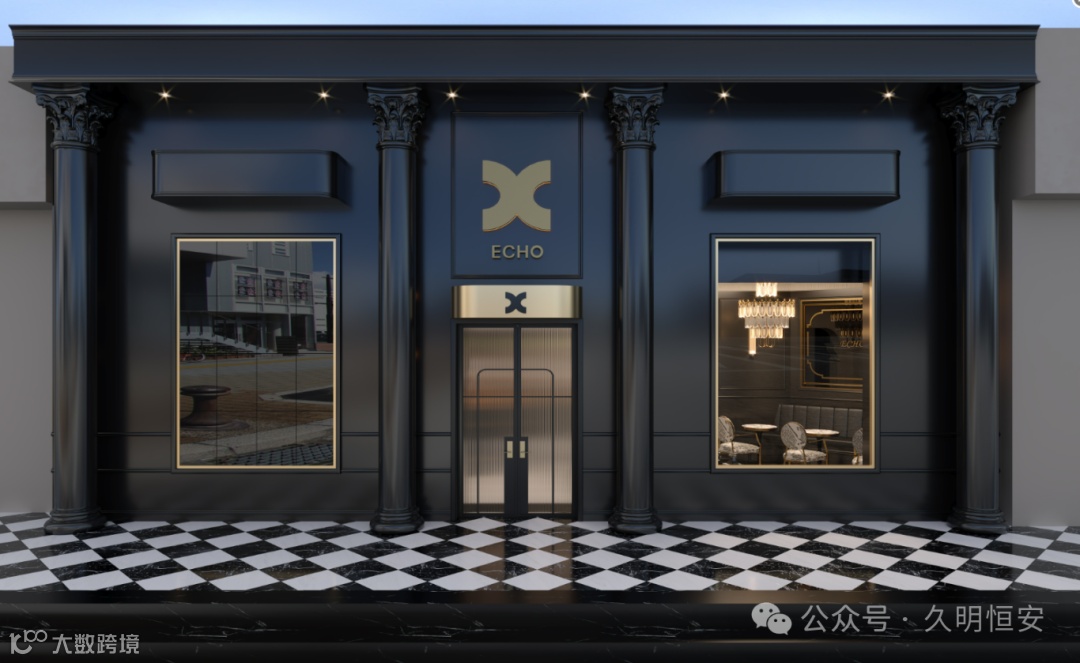 X ECHO店铺的外观设计融合了经典与现代元素。墙面上的装饰性柱子和门框细节增加了建筑的装饰性,这些元素通常与古典建筑相关,但在这家店铺中被现代化处理,以适应整体的设计风格。