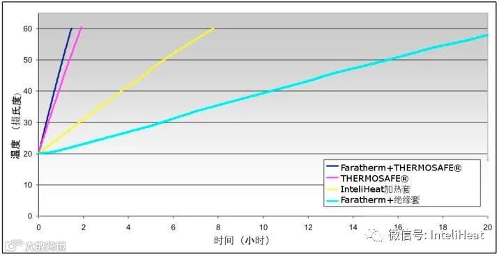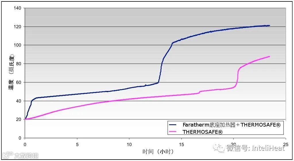 Faratherm可以加热205L以下的桶和其他容器。塑料、金属和不锈钢材质的容器都适用。虽然它可以独立加热桶和其他容器,但是为了减少加热时间,我们推荐将它和LMK的加热套或者Thermosafe®一起使用,是否再加上硬质保温盖都可以(需注意加上保温盖时的认证T等级可能会发生改变)。测试表明,当使用Thermosafe®来融化如稀油和石蜡类物料时,配合使用Faratherm会大大提高加热速率(见下图)。