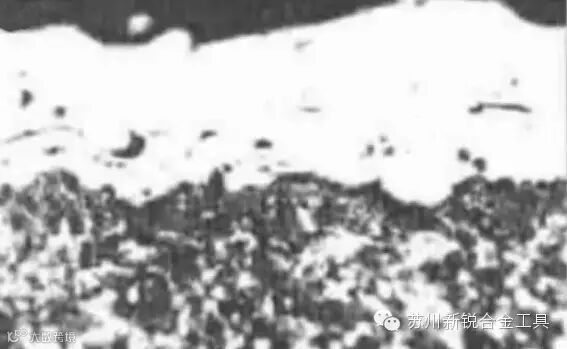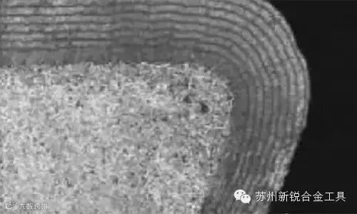 因此化学退涂不仅会将涂层去掉,而且还将溶解硬质合金的钴结合剂,在退涂过程中造成钴流失,损坏硬质合金基体材料的微观结构。如图2所示,切削刃的微观损坏将产生锯齿状表面,引起刀具基体材料表面脆化等问题,并对后续涂覆和使用产生不利影响。