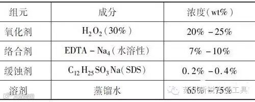 在化学退涂氮化钛涂层中,用碱性退涂液的氧化性来氧化涂层,以达到退涂目的。退涂液成分如表1所示。