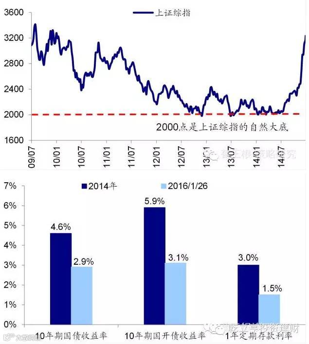因此,如果仅从静态角度估量,从2014年年中到现在,上证综指因利率下降将带来30-40%的估值提升,以2000点为基准的话,对应合理底部也应在2700点左右。而创业板受益于利率下降和净利润增长的双重贡献,底部将至少抬升70%,以2014年中1200点为自然底的话,当下合理的底部大概在2000点左右。