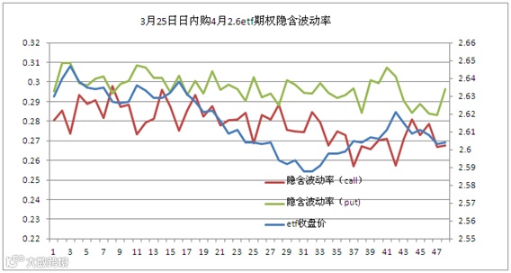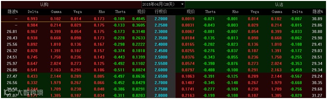 今天50ETF下跌1.29%,然而投资者表现淡定,认购期权和认沽期权的隐含波动率纷纷下降。我们猜测投资者改作卖出波动率策略导致隐含波动率下降,这也就是说较多的投资者判断后市会是震荡走势。观察4月份合约成交量,深度虚值认购期权成交量明显高于其他合约,而其隐含波动率也下降较多,可见该合约被卖出较多,我们推测投资者是利用虚值合约做备对策略,这也说明他们认为50ETF短期内涨到2.8以上的概率较小。