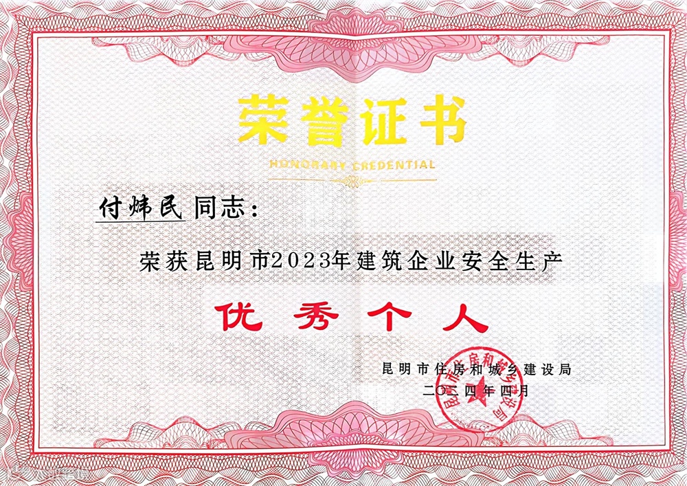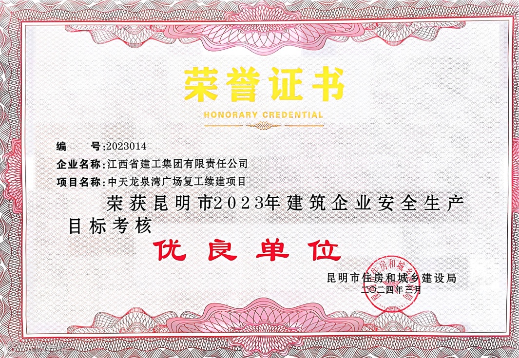近日,昆明市住房和城乡建设局公布了2023年度昆明市建筑企业安全生产目标考核优良单位和安全生产优秀个人名单,江西建工国内工程公司承建的中天龙泉湾广场复工续建项目荣获优良单位称号,项目经理付炜民荣获优秀个人称号。