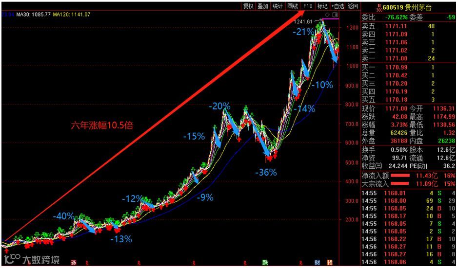 如果这是一套房子,投资者从低位持有到现在是有可能实现这个收益的,但这是股票,和房子的区别是:价格每日展现在面前、价格波动频繁、流动性非常好(随时可以出手且没有税收)。这三点决定了99%的人无法实现这个理想化的收益率,因为在这六年里,一共有十次回踩震荡,最小的震荡幅度也是-10%,而最大的回调幅度为-40%。面对如此震荡还能平静如水到终点的人,十分稀有。