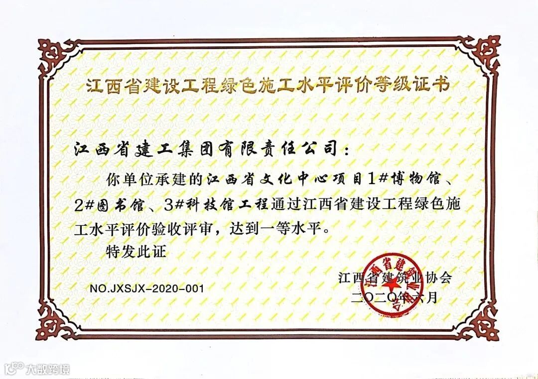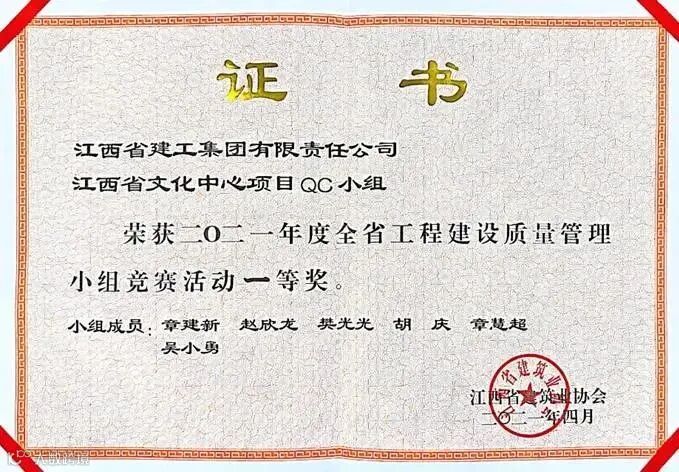 江西建工国内工程公司始终把争创鲁班奖作为项目工程质量的最高追求。在承接了达到创鲁班奖条件的江西省文化中心项目施工总承包任务后,公司选派了组织能力强、施工技术好、管理经验丰富的专业人员组建强有力的项目班子,按照“精心策划、过程控制、科学管理”的要求,编制了创优实施方案,明确了创建重点,并带领各参建单位精心施工,严格规范操作,强化质量管理,高标准、严要求建设好项目,将精细和严谨贯穿于施工全过程。项目于2016年8月1日开工,2020年5月12日竣工验收并交付使用,建设程序合法,验收手续齐全,各分部工程均一次验收合格。