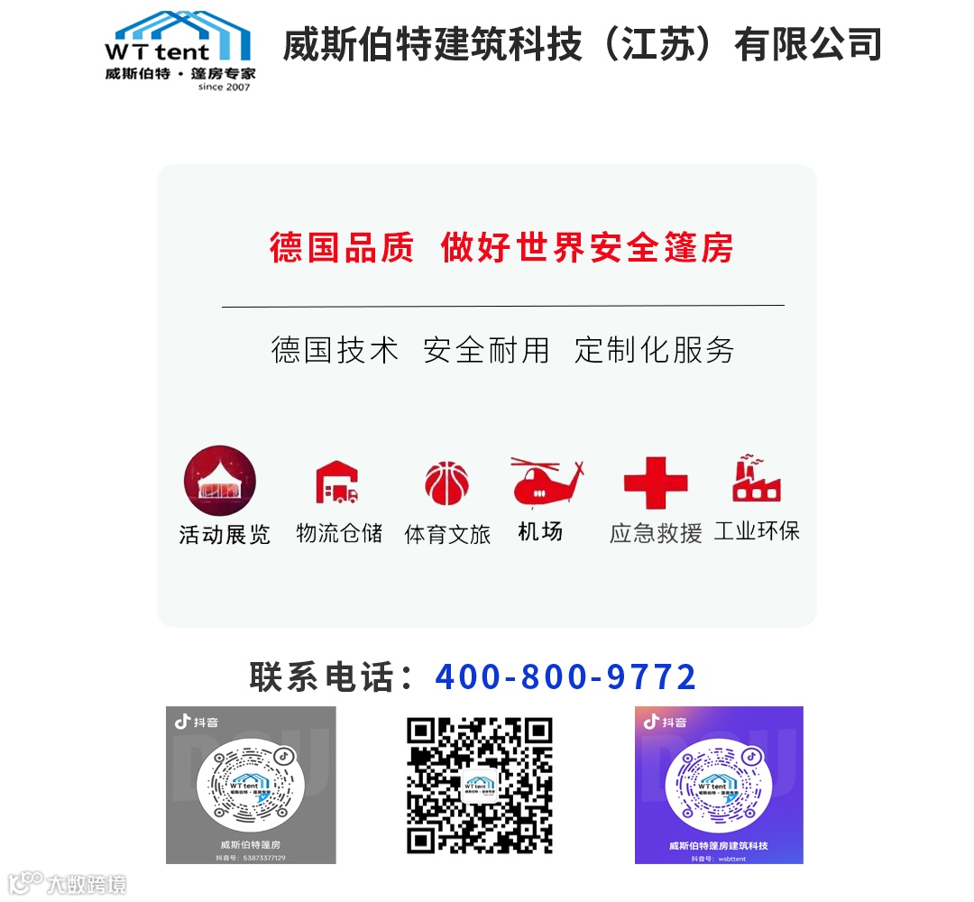 导读:关于威斯伯特篷房 威斯伯特建筑科技(江苏)有限公司所有产品均采用德国制造标准,主体结构采用高强度铝合金。