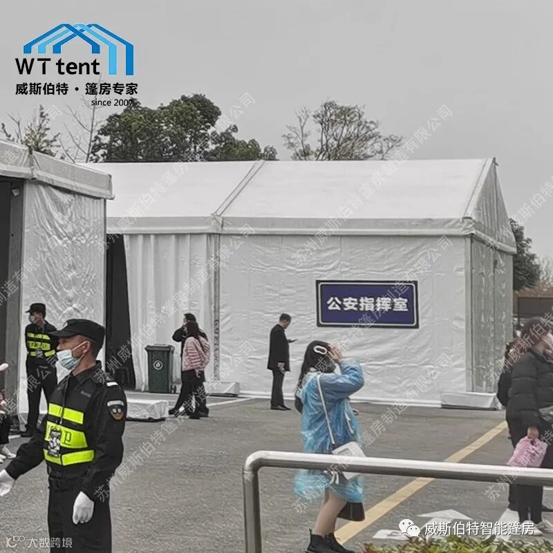 重大活动现场,比如音乐节这样上万人集会的现场,需要公安人员到场指挥维稳,本次篷房使用15m跨度的篷房。全封闭围帘,保密性好。