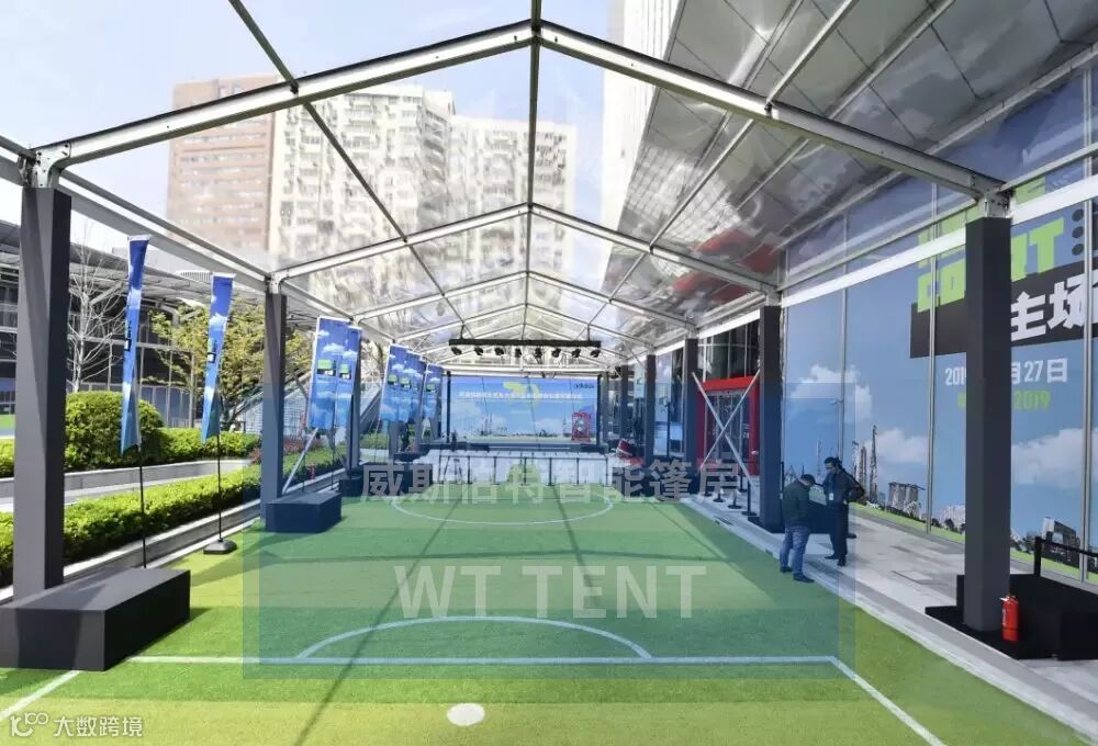 在综合考虑活动地点、人员动线、参与人数、安全保障、天气状况、后续维护等等多种情况后。最终将活动地点定在园区内车道上,并以道旗、全透明铝合金篷房、足球场双色草皮及看台搭建,营造了以主场为概念的环境与气氛。