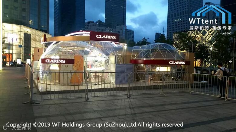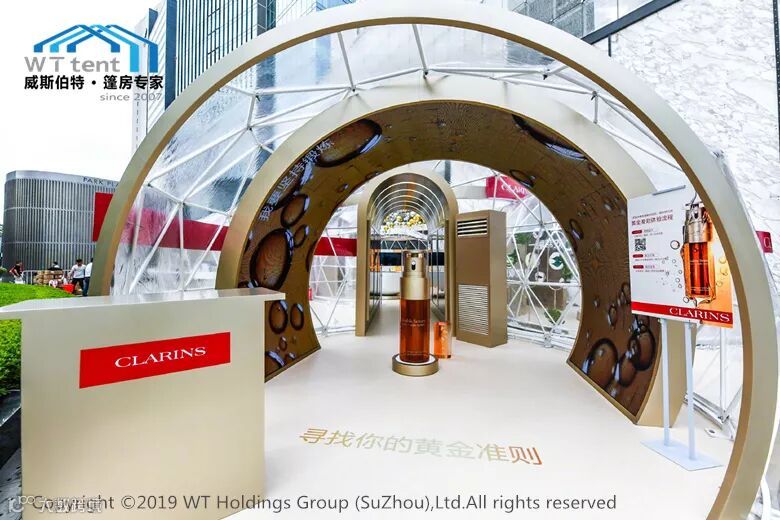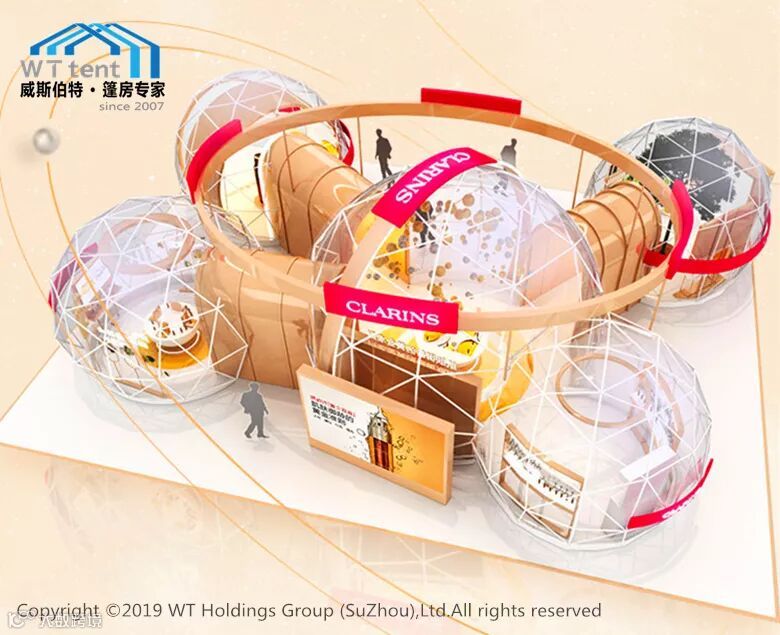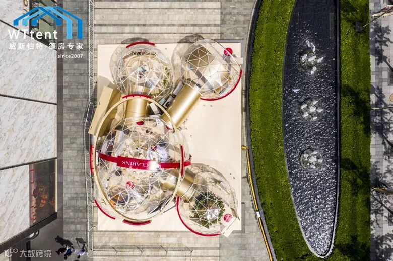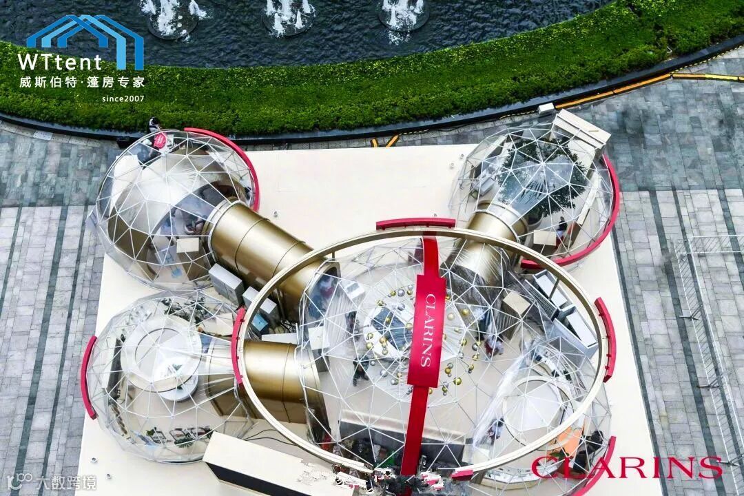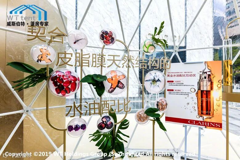 近日,威斯伯特智能篷房与法国高端护肤品牌--娇韵诗达成重磅合作,打造了一座由若干个定制设计的2/3球型篷房连体组成的“御龄时光机”。如此独特的设计灵感来源于皮肤中的胶原蛋白分子,象征着皮肤水润光泽的秘密。