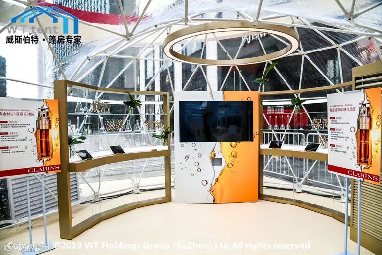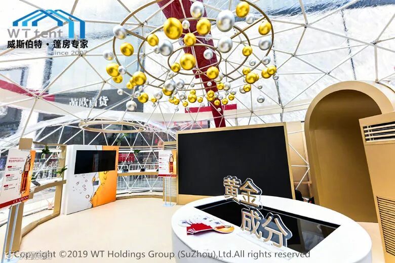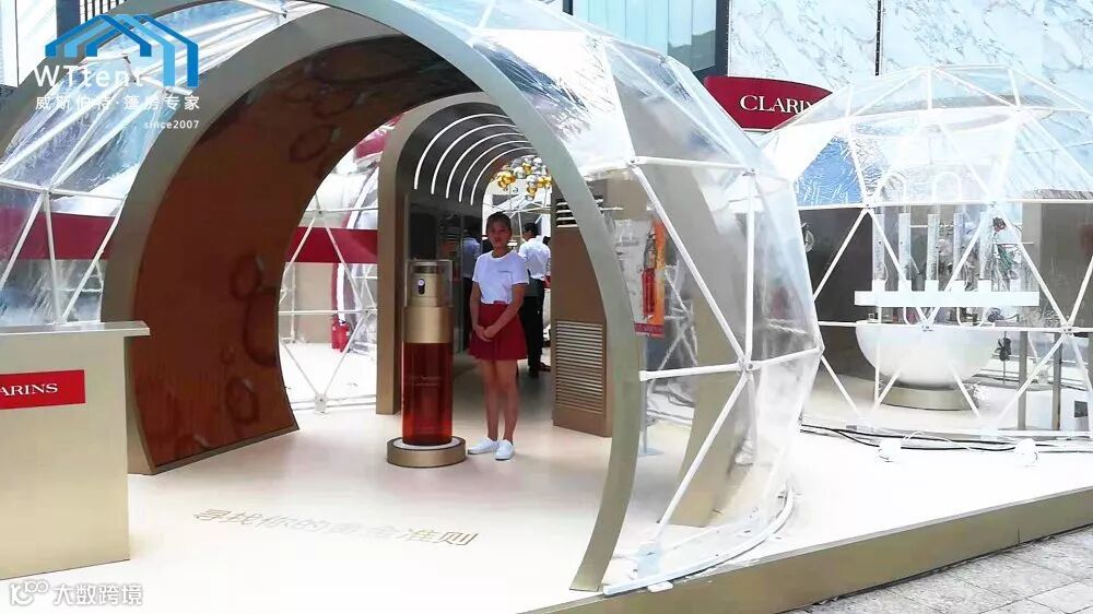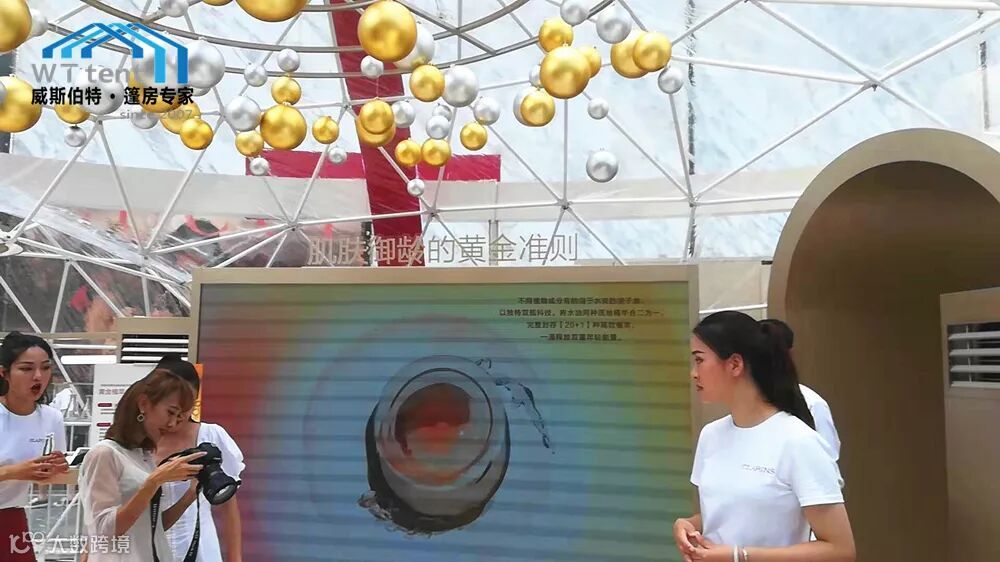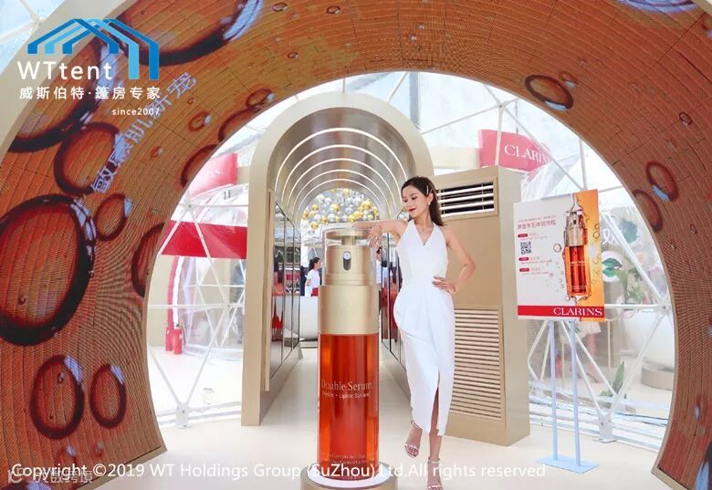 刚走近,就会被其独特的造型所吸引,球型篷房外观设计独有的弧线美感,清爽的白色结构线条搭配上香槟色拱门,专业的广告设计,跳色的装饰品...这一切让人仿佛沉浸在芳香的双萃精华中难以自拔。