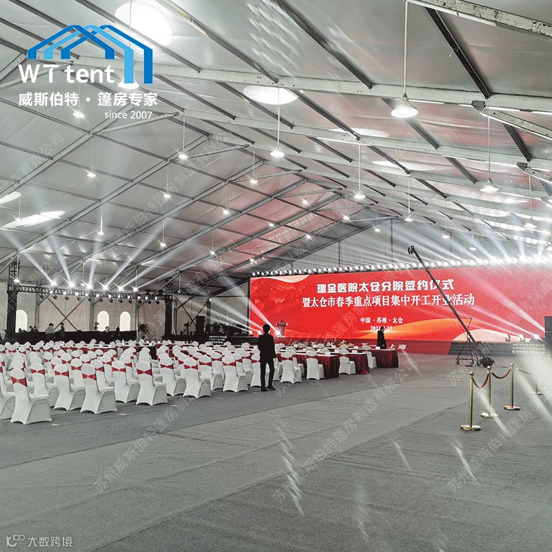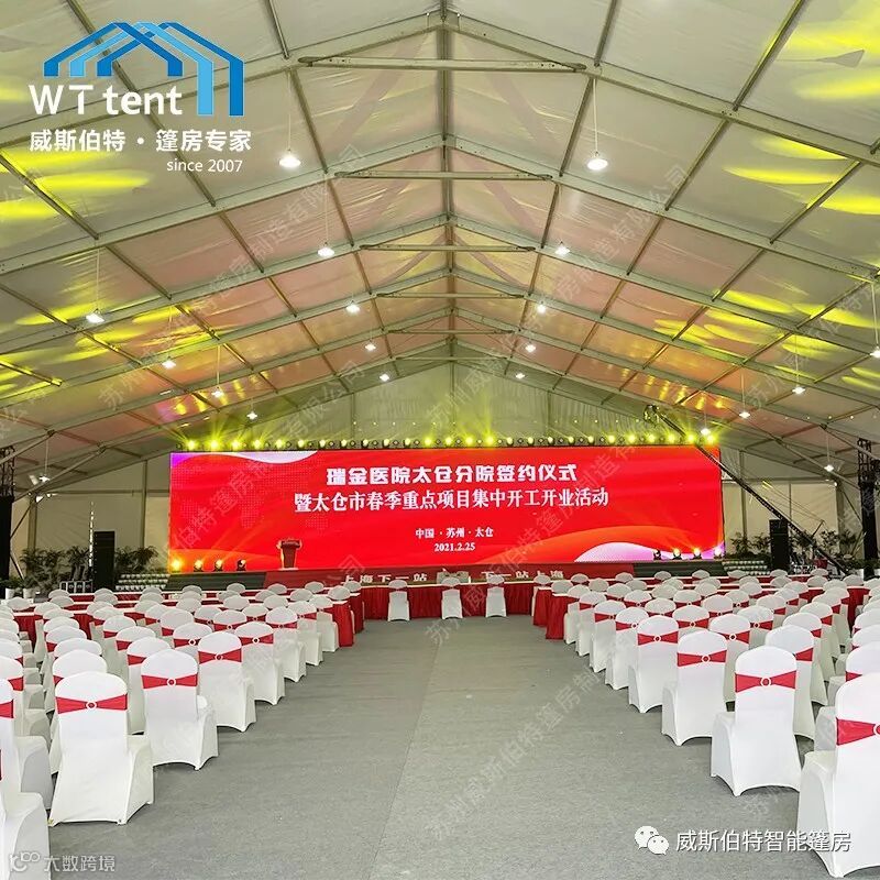 此次盛典的主体篷房是一座跨度40米、长度50米、边高4米的铝合金智能篷房。总面积为2000平方米。