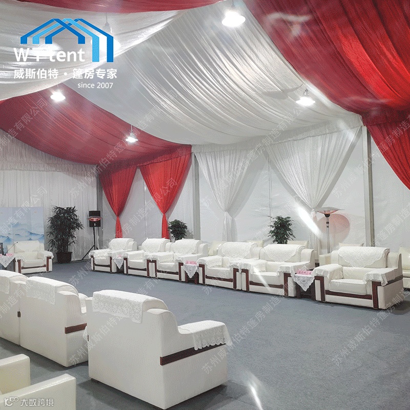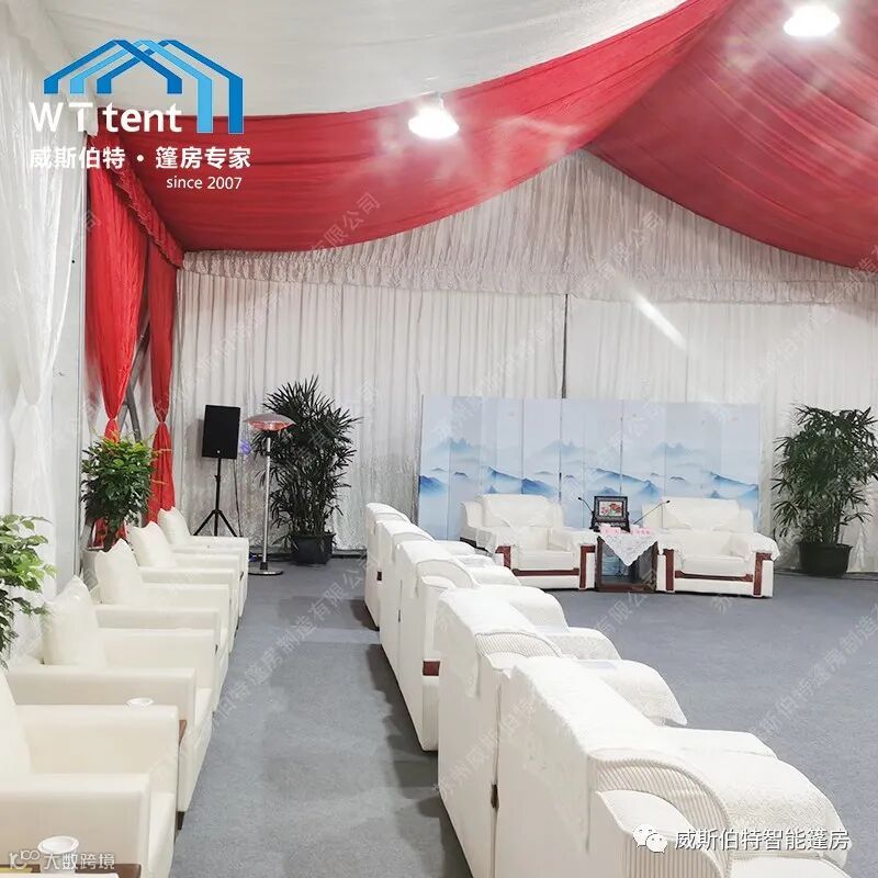 会客厅篷房内部添加红白相间装饰幔,温馨、喜气的现场氛围,为与会来宾营造了宾至如归的氛围。