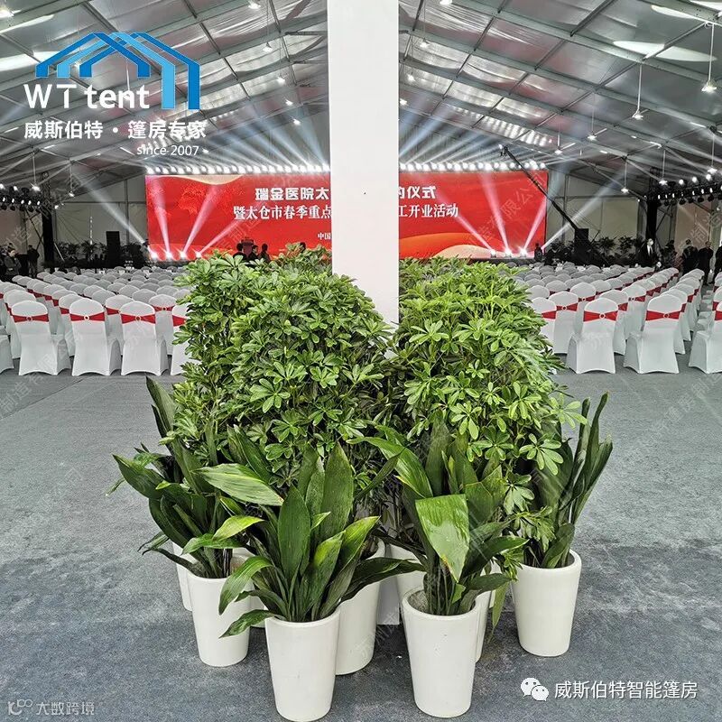 好马配好鞍,美人配红装。纯白的智能篷房搭配生机盎然的绿植,给会场带来了不少活力与生机。