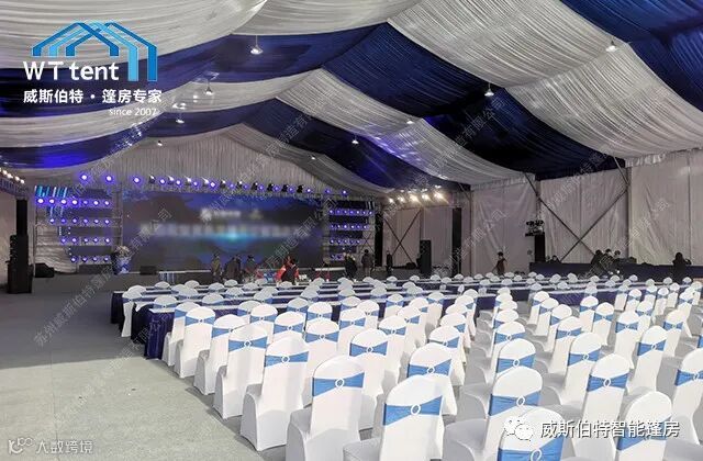 为符合科技感、庄重感并重的现场主题,威斯伯特为此次隆重的奠基仪式选用了蓝白相间的顶幔及浅灰色的地毯。
