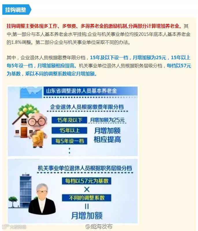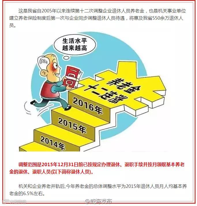 山东省人社厅、财政厅日前发布《关于2016年调整退休人员基本养老金的通知》,将对2015年12月31日前退休、退职人员,进行基本养老金调整。机关和企业养老并轨后,今年养老金的总体调整水平为2015年退休人员月人均基本养老金的6.5%左右。