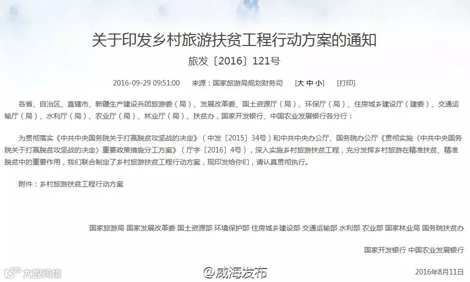 日前,国家旅游局官方网站发布了由国家旅游局、国家发改委等10多个部门和单位共同制定并印发的《乡村旅游扶贫工程行动方案》。方案显示,山东省共1051个村被列入全国乡村旅游扶贫重点村,其中,威海有46个村。快来看看有没有你家。