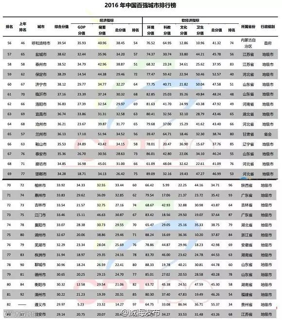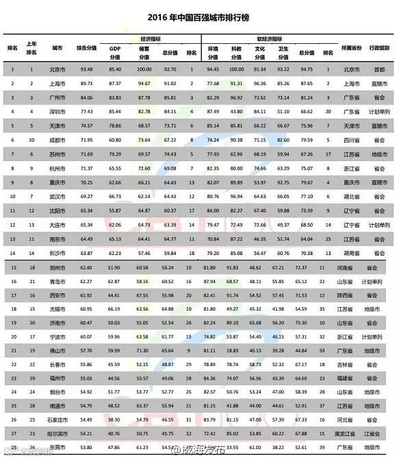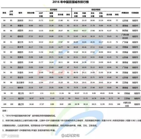 导读:由华顿经济研究院(原上海经济发展研究所)编制的“2016年中国百强城市排行榜”日前在沪发布,威海入围百强城市