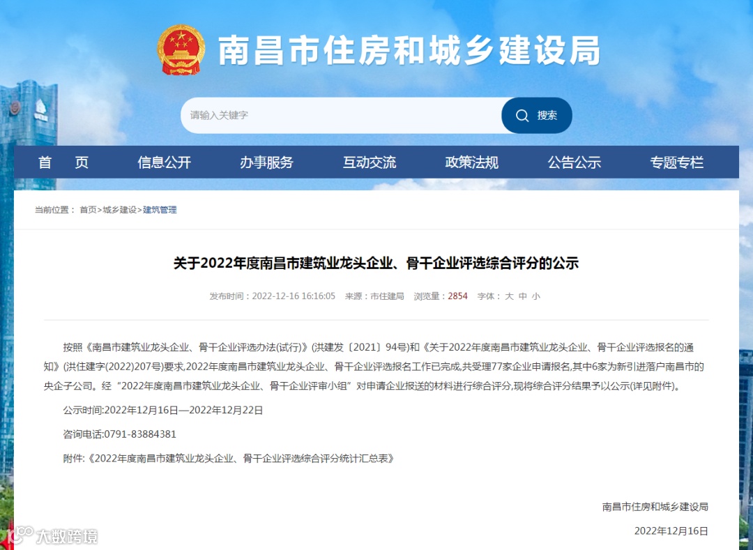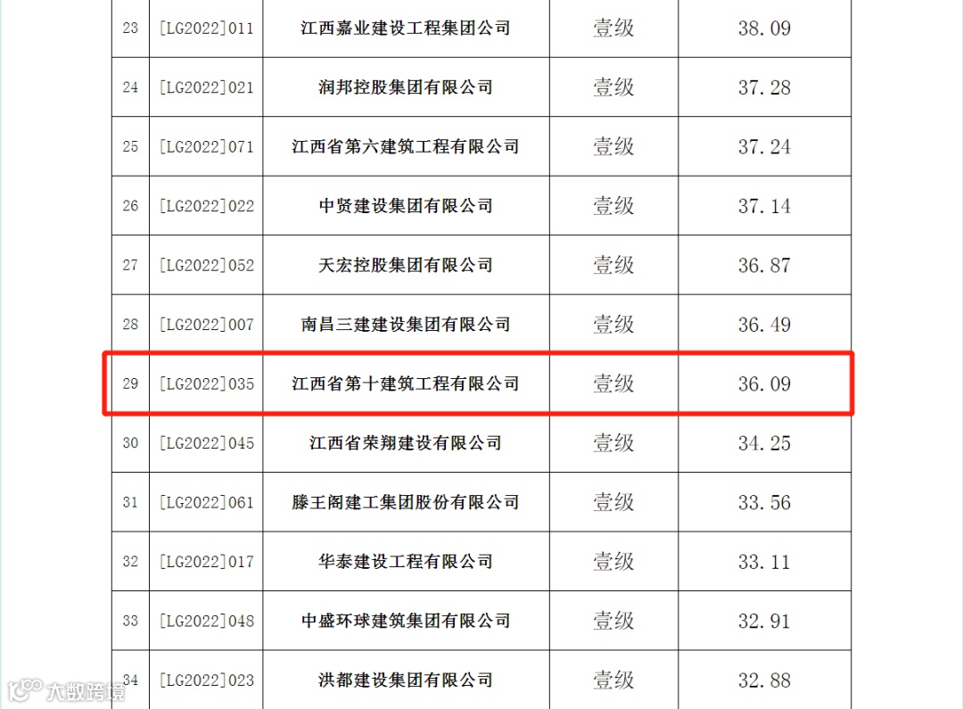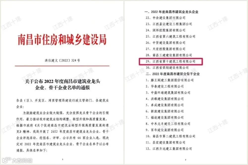 近日,南昌市住房和城乡建设局发文公布了2022年度南昌市建筑业龙头企业、骨干企业名单共计66个。江西十建成功入选,荣登《2022年度南昌市建筑业龙头企业》榜单!