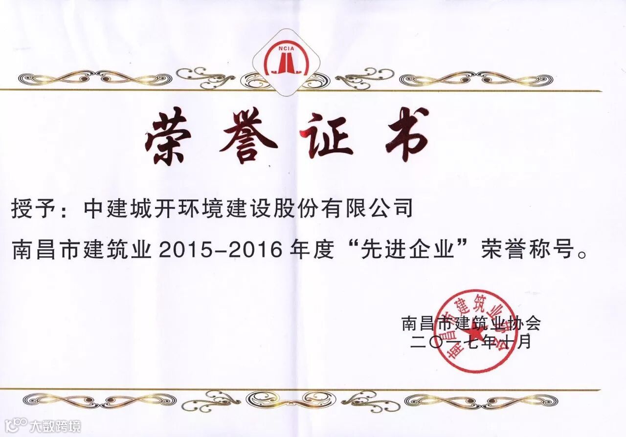 近日,又一喜讯传来,中建城开环境建设股份有限公司荣获“南昌市建筑业2015—2016年度先进企业”荣誉称号。这是我公司第二次获此殊荣。