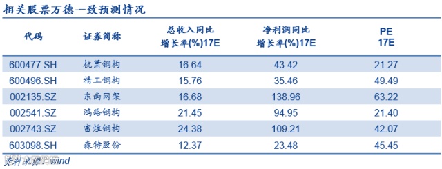 钢结构装配式市场近3000亿,扩增市场空间优化商业模式:装配式建筑是绿色建筑的典型代表,减少能源使用和垃圾排放,与此同时装配式建筑的大规模使用可以带动配套产业的升级,政府推广意愿强。2017年住建部发文指出,到2020年,全国装配式建筑占新建建筑比例达到15%以上,2015年该比例不足3%,根据我们测算,2016-2020年,装配式建筑市场需求年复合增长率将达到37%以上,5年市场空间增量近2万亿元。专家预计钢结构装配式建筑占总市场比例在10%-20%区间,以15%测算,钢结构装配式建筑市场空间近3000亿元,传统钢结构主要应用在公建领域,现在钢结构将在住宅市场推广应用,拓宽商业边界,市场空间增量可观。其次钢结构装配式建筑是天然的EPC总包形式,促使钢结构企业从传统的加工分包向施工总包及EPC转型,商业模式优化,产业生命周期延长,同时装配式建筑具有一定的进入壁垒,龙头企业率先受益。