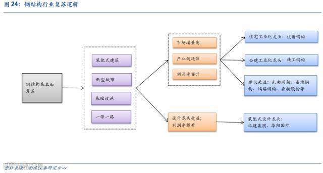 我们认为2017年受装配式建筑推广、新型城市建设、基础设施建设和一带一路推广,钢结构行业走出低迷困境,即将复苏。(1)装配式建筑:作为绿色建筑代表,装配式建筑十三五期间年均复合增速达到37%以上,5年市场空间增量近2万亿,也是钢结构行业发展主要推动力。(2)新型城市建设:雄安新区的建设将引领全国新型城市建设方向,围绕绿色城市、智慧城市、人文城市的定位,装配式建筑将获有效推广,人文工程等大型钢结构建筑需求上升。(3)基础设施—桥梁钢结构:特大桥梁占公路桥梁里程的比重分别为从2011年的12.1%提升至2015年的15.0%,特大桥梁占比不断提高,特大桥梁壁垒多,龙头企业有望受益。(4)一带一路:随着一带一路的推广,钢结构行业出海进程加速,2014、2015年钢结构协会会员企业出口钢结构产量分别上升了220%和135%。综上所述,我们认为钢结构行业即将迎来全面复苏。建议积极关注处于产业链上游的装配式建筑设计龙头华建集团和华阳国际;钢结构企业将从商业模式和市场容量方面双重受益:钢结构企业从传统的加工分包向施工总包及EPC转型,从产业下游向上游延伸,产业链延长盈利能力大幅提升;另外,装配式建筑在住宅领域的推广,使得钢结构企业商业边界拓宽,从原有以公建为主要应用市场向住宅延伸,市场容量有效扩容。钢结构装配我们重点推荐住宅工业龙头杭萧钢构、公建装配式龙头精工钢构,建议关注鸿路钢构、富煌钢构和东南网架以及森特股份等。
