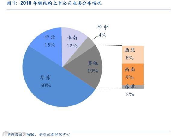 根据钢结构上市公司公布的2016年营业收入分布统计,我国钢结构上市公司主要业务集中在华东区域,占比高达50%,其次是华北、华南分别占比15%,12% 。东北占比最低,仅占2 %。