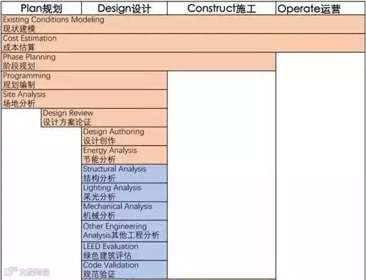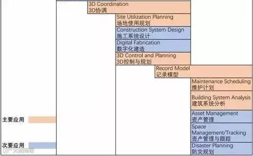 建筑业的工序在国内外实质上大同小异,BIM的应用也是如此,但有些应用二者的划分尺度不一样,如前者的“3D协调”与后者的“管线综合”类似,但后者的描述过于狭窄,好像仅限于管线的碰撞分析,而结构梁柱引起的净空高度不够等其他构建协调优化问题就不管了,所以前者的描述较为全面。