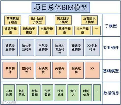 所有的子模型都是在同一个基础模型上生成的,这个基础模型包括了建筑物最基本的构架:场地的地理坐标与范围、柱、梁、楼板、墙体、楼层、建筑空间等,而专业的子模型就是在基础模型的上面添加各自的专业构件形成的,这里专业子模型与基础模型的关系就相当一个引用与被引用的关系,基础模型的所有信息被各个子模型共享。