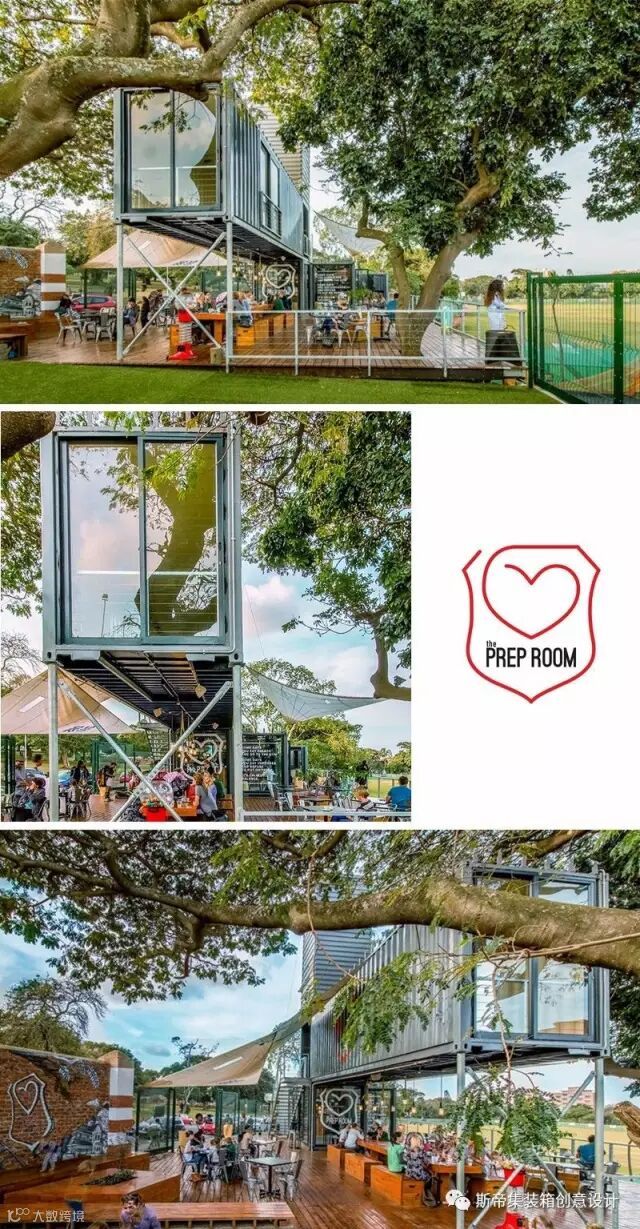 占地约250平方米的Prep Room餐厅,位于南非德班一家预科学校门口旁边。乐高积木风格的堆叠集装箱建筑,广受家长和学生欢迎。架高二层式的设计,遮盖部分的一层平台,两边再配以遮阳棚,舒适的座位区成为家长们最喜爱的位置。