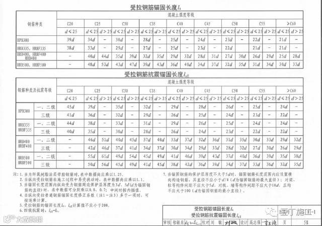 (1)本工程所有梁、柱、剪力墙(含连梁、暗柱)、板纵向受拉钢筋基本锚固长度Lab、LabE、受拉钢筋锚固长度La、抗震锚固长度LaE详图集(16G101-1)第58页。如下图:
