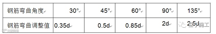 5)钢筋弯曲后,弯曲处内皮收缩、外皮延伸、轴线长度不变,弯曲处形成圆弧,弯起后尺寸大于下料尺寸,弯曲调整值如下表