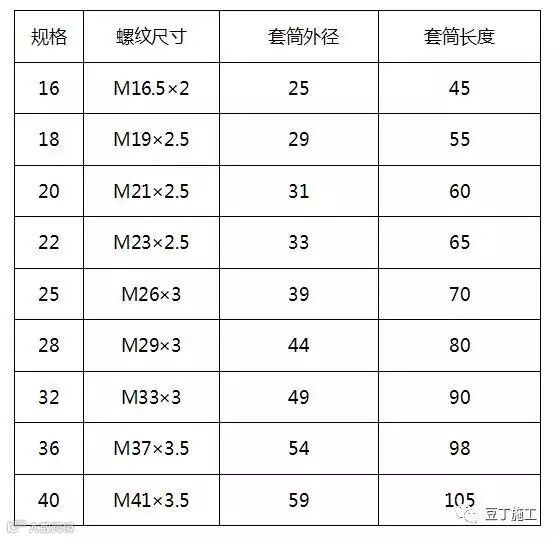 4、检验:用专用环规检验直螺纹丝头的有效长度及螺纹中径,直螺纹丝头的有效长度牙数(牙数如下图),如有不合格的丝头应切断重新加工,最后在直螺纹丝头部位装上保护帽。环规的长度控制丝头螺纹长度,丝头的压数比环规的牙数长、短一个牙均视为长度合格的丝头。