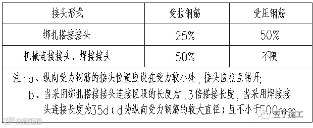 b、当采用直螺纹连接时, 受力钢筋接头的位置应相应错开,相邻接头从任一接头中心错开长度为钢筋直径35d,接头截面百分率梁板≤50%,柱≤50%。当采用绑扎搭接时,在同一连接区段内(1.3Ll),接头面积百分率梁板≤50%,柱≤50%。