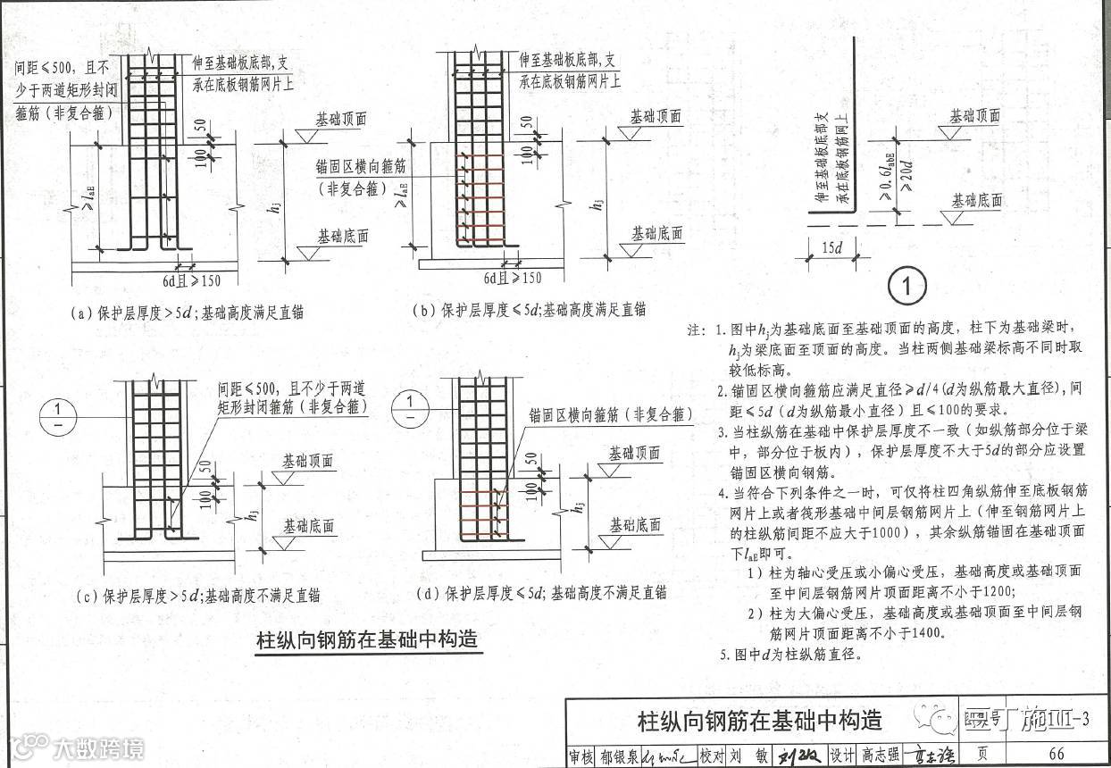 当柱为轴心受压或小偏心受压,独立基础、条形基础高度不小于1200mm时,或当柱为大偏心受压,独立基础、条形基础高度不小于1400mm时,可仅将柱四角插筋伸至底板钢筋网片上,其他钢筋满足锚固长度即可。参照16G101-3中第66页,具体构造如下图: