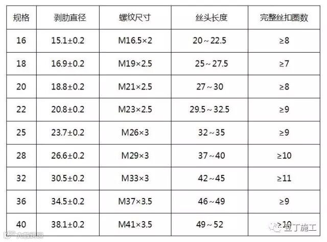 2)钢筋丝头加工质量(施工单位保证),钢筋直螺纹丝头的有效长度及螺纹中径符合环规的尺寸,钢筋直螺纹丝头有效长度内的完整牙数符合上表中的要求。