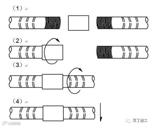 7、钢筋的连接:同径和异径普通连接套,用扳手或管钳将直螺纹连接套与一段钢筋拧到位,再将另一端钢筋与连接套拧到位。可调连接套,将不能转动的钢筋加工成左旋螺纹,用可调连接套将待连接钢筋对上连接套入口,转动连接钢筋对上连接套入口,转动连接套即可使钢筋同时旋入连接套,钢筋露丝1P—1.5P(P为螺距),如下图: