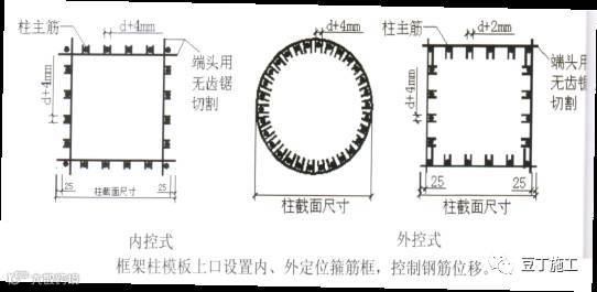 3、框架柱模板上口设置内外定位箍筋框,控制钢筋位移。如图所示: