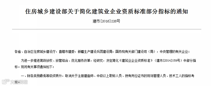 10月19日,住房城乡建设部公布《关于简化建筑业企业资质标准部分指标的通知》(建市[2016]226号)。紧接着,住建部要求开展建筑业企业资质申报业绩核查。两个重磅炸弹!!!此文一出,多少人哭瞎了双眼…… 23