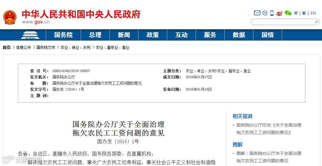 1月19日,国务院发布2016年1号文--《关于全面治理拖欠农民工资问题的意见》(国办发〔2016〕1号)。要求:政府投资项目一律不得以施工企业带资承包的方式进行建设,并严禁将带资承包有关内容写入工程承包合同及补充条款;全面推行施工过程结算。