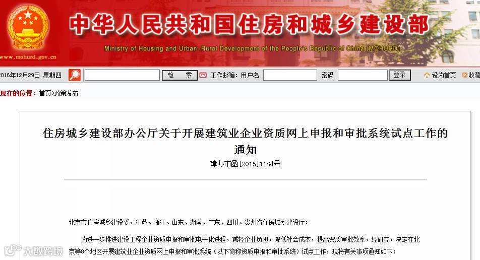 1月15日,住建部下发通知,在北京、江苏、浙江、山东、湖南、广东、四川、贵州8个地区,开展建筑业企业资质网上申报和审批试点。 02